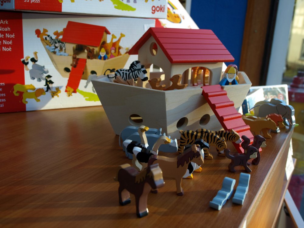 Örkin hans Nóa - úr tré. Fullt af dýrum og þau hjón bæði, Nói og frú. Hægt að opna húsið og hleypa dýrum og mönnum undir þiljar. Lesa meira