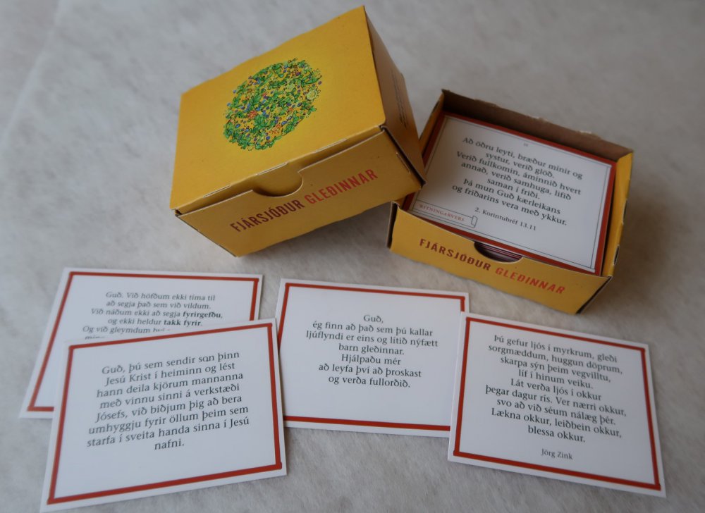 Fjársjóður geymir 84 kort, öðrum megin er biblíuvers sem auðvelt er að tileinka sér, hinum megin er bæn eða andlegt húsráð!