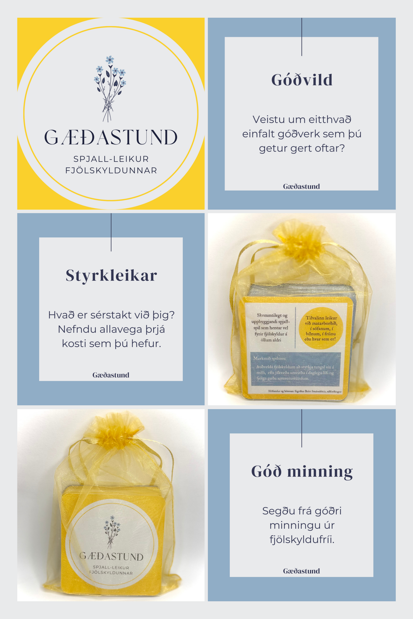 Gæðastund er skemmtilegur og hvetjandi spjall leikur sem auðveldar fjölskyldum að efla jákvæða umræðu í daglegu lífi. Spilið er hentugt fyrir fjölskyldur á öllum aldri og getur skilið mikið eftir sig og gefið dýrmætar minningar. Nútímalíf fjölskyldunnar er oft annasamt. Því er mikilvægt að nýta vel þær stundir sem fjölskyldan hefur saman og breyta þannig venjulegum stundum í gæðastundir. Gæðastund samanstendur af 55 jákvæðum og eflandi spurningum. Tilvalinn leikur við matarborðið, í sófanum, í fríinu eða hvar sem er!